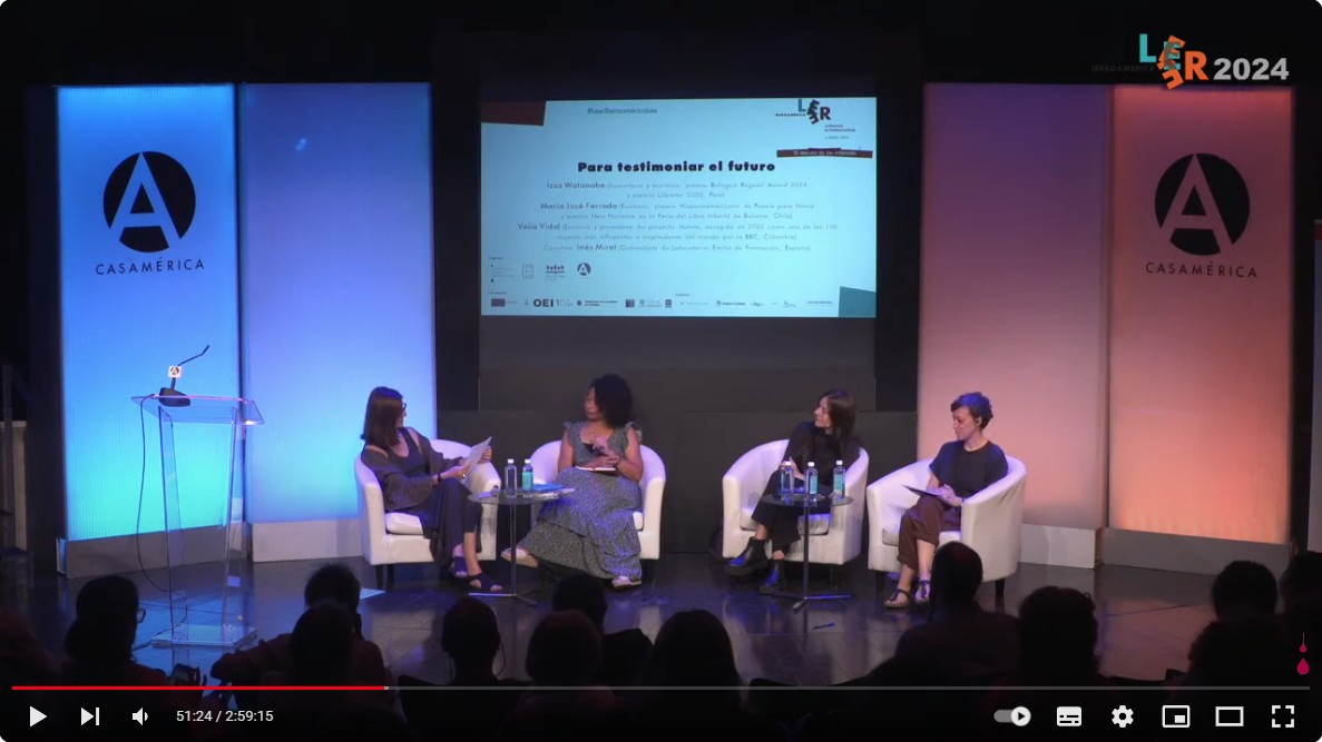 Para testimoniar el futuro Issa Watanabe (Ilustradora y escritora, premio Bologna Regazzi Award 2024 y premio Llibreter 2020, Perú) María José Ferrada (Escritora, premio Hispanoamericano de Poesía para Niños y premio New Horizons de la Feria del Libro Infantil de Bolonia, Chile) Velia Vidal (Escritora y promotora del proyecto Motete, escogida en 2022 como una de las 100 mujeres más influyentes e inspiradoras del mundo por la BBC, Colombia) Coordina Inés Miret (Codirectora de Laboratorio Emilia de Formación, España) |