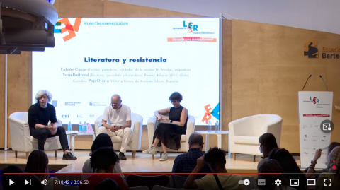 Literatura y resistencia Fabián Casas (Escritor, periodista, fundador de la revista 18 Whiskys, Argentina) Sara Bertrand (Escritora, periodista y formadora, Premio Bolonia 2017, Chile) Coordina Pep Olona (Editor y librero de Arrebato Libros, España) |
