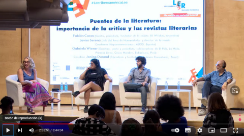 Puentes de la literatura: importancia de la crítica y las revistas literarias Fabián Casas (Escritor, periodista, fundador de la revista 18 Whiskys, Argentina) Javier Serena (Jefe del Área de Humanidades y director de la revista Cuadernos Hispanoamericanos, AECID, España) Gabriela Wiener (Escritora, poeta y periodista, colaboradora de El País, La Mula, Primera Línea, Cosas Hombre, Eldiario.es, Perú) Coordina Janine Durand (Educadora y fundadora de Jnana Consultoria, Brasil) |