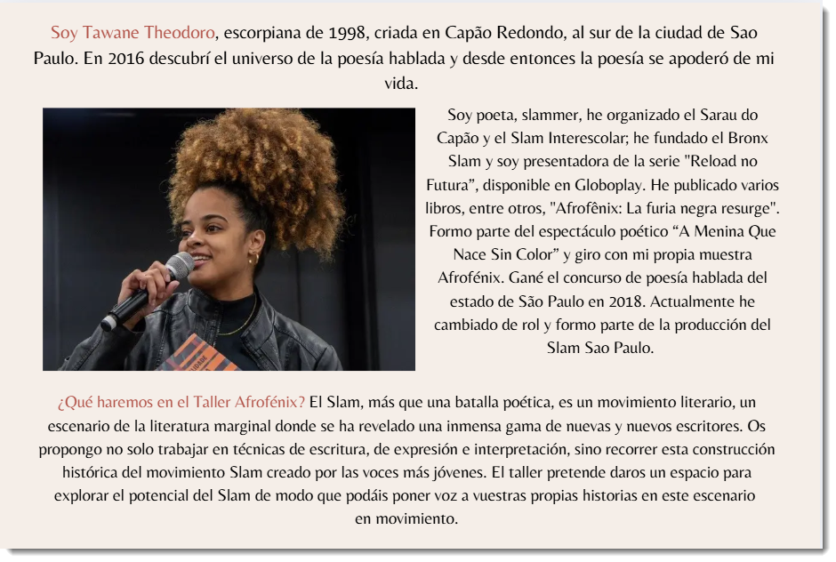 Nacida en 1998 en Capão Redondo, al sur de São Paulo. Es poeta y slammer desde 2016. También es una de las organizadoras del Sarau do Capão y del Slam do Bronx, una de las presentadoras del canal Reload y poeta formadora de Slam intercolegial (proyecto Slam de Guilhermina). Autora del libro Afrofênix: A fúria negra ressurge (Editora Quirino, 2019).